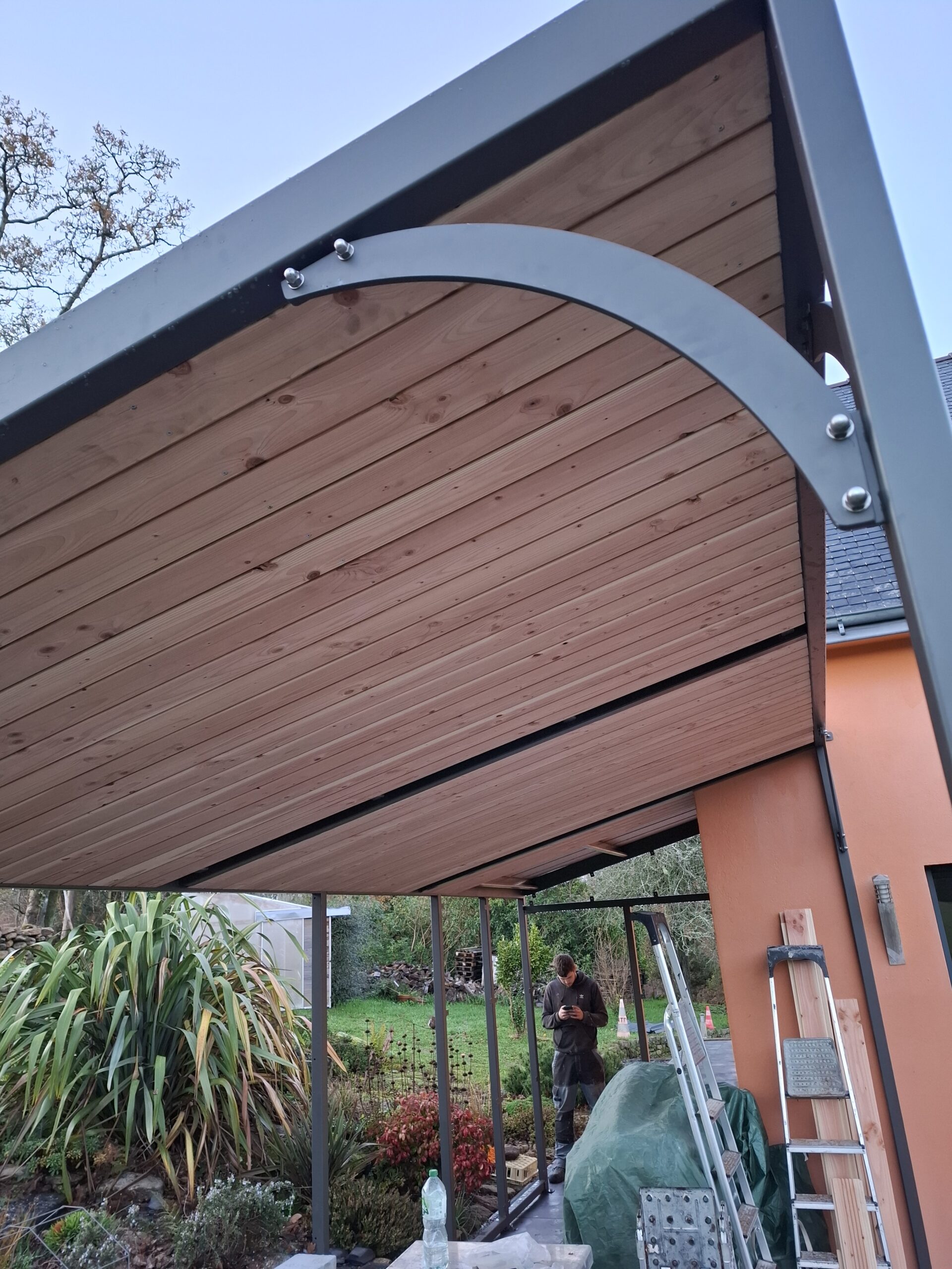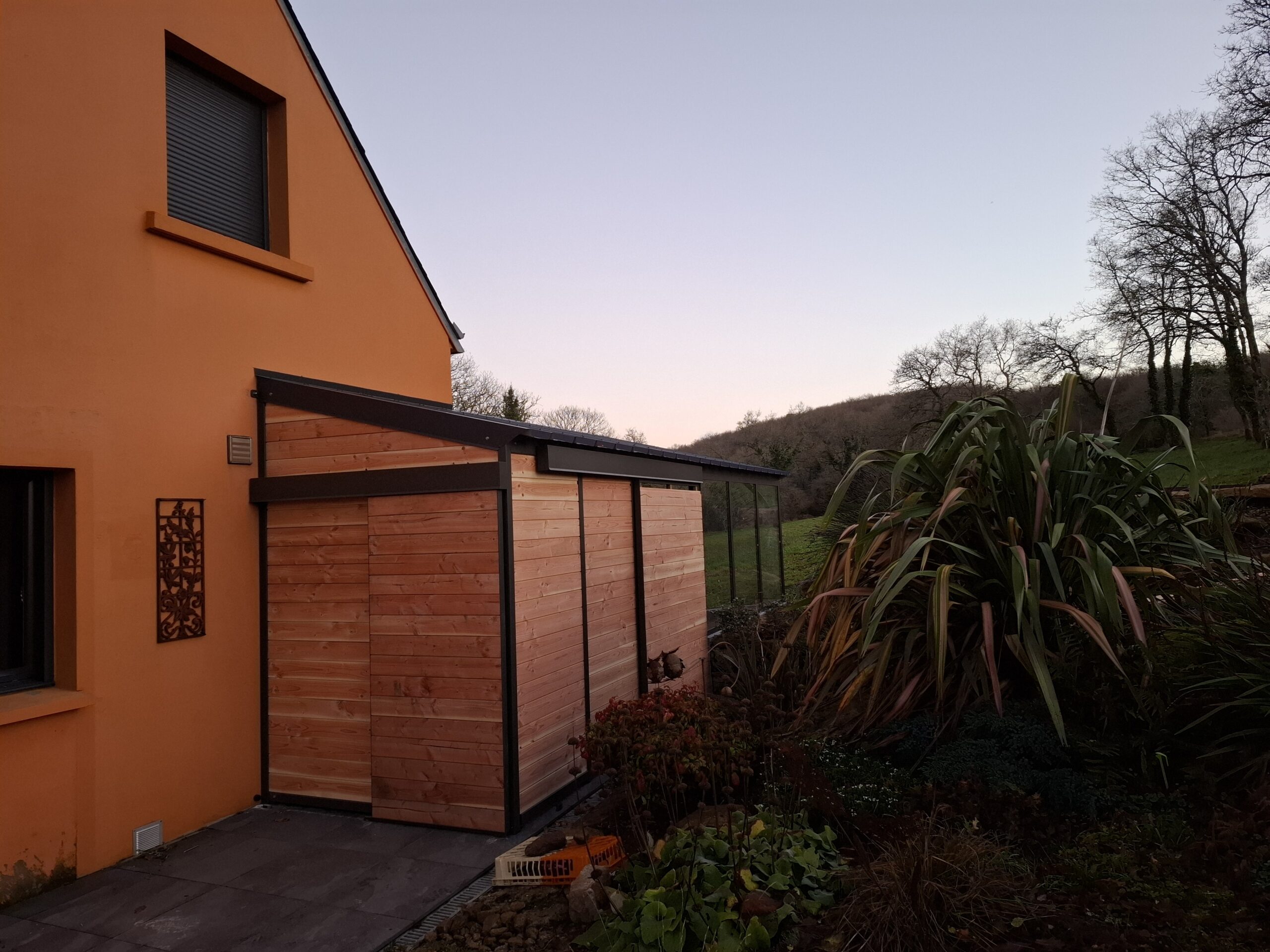 Véranda semi-ouverte pour être à l’abri du vent et du soleil. Grande verrière panoramique et coulissants pour accéder aux jardins. Sous face et bardage Douglass.